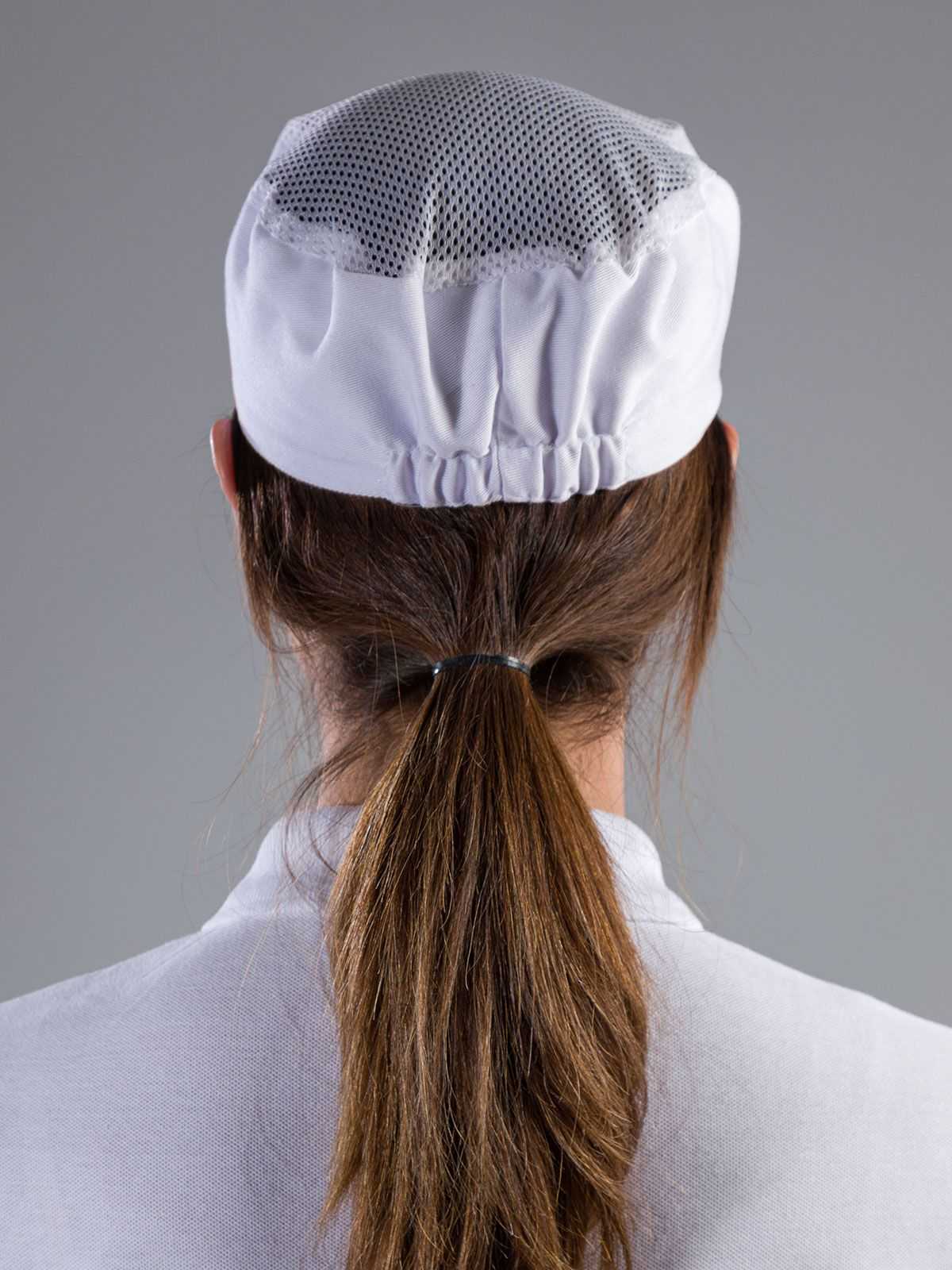 Cappello da alimentarista con visiera, rete sulla parte superiore e piccolo elastico sul retro. Lavabile a 40°C.