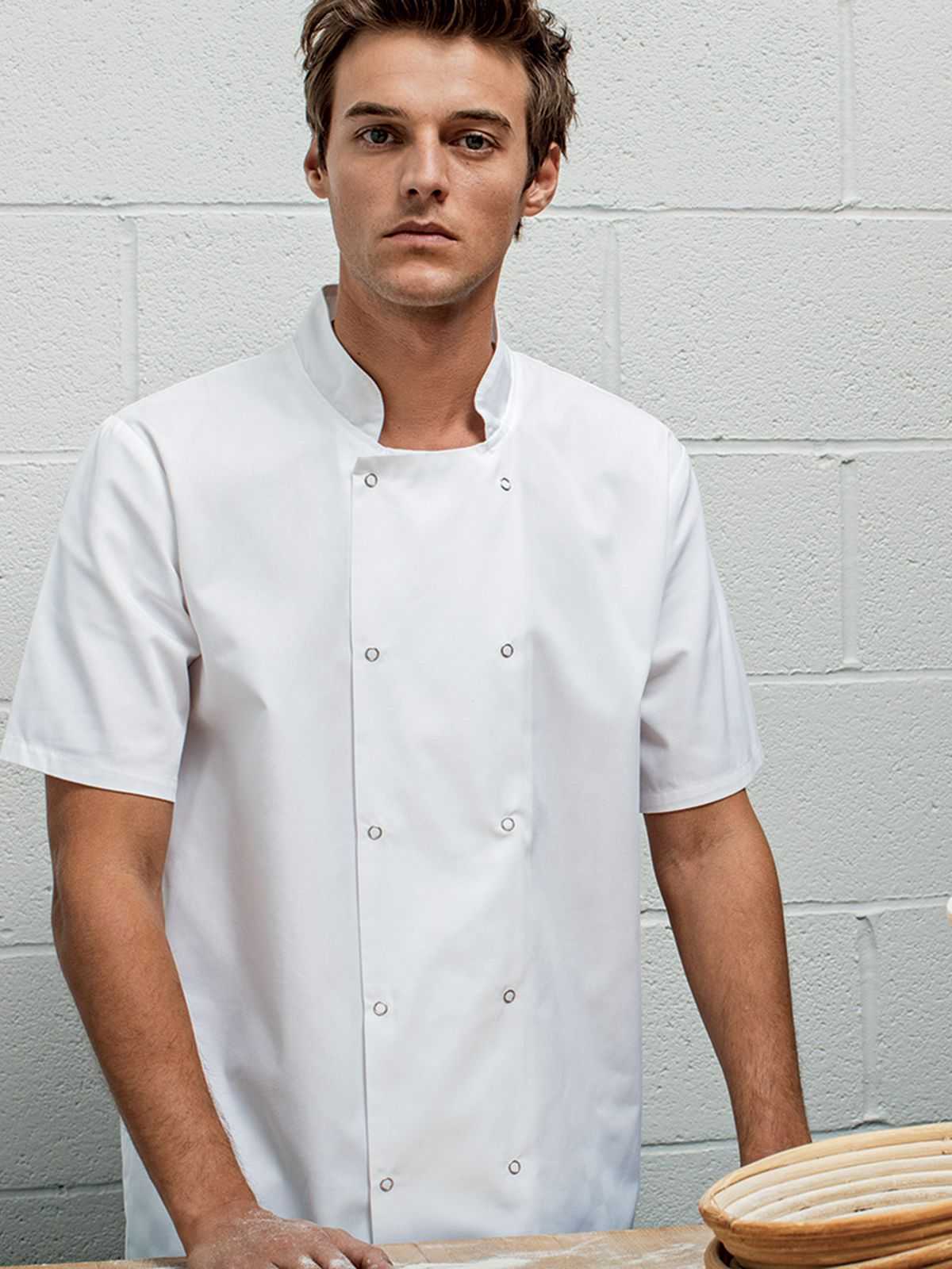 Giacca da Chef dal tessuto morbido, collo alla coreana con impunture, manica corta, bottoni a pressione, stile unisex. Lavabile a 60°C.