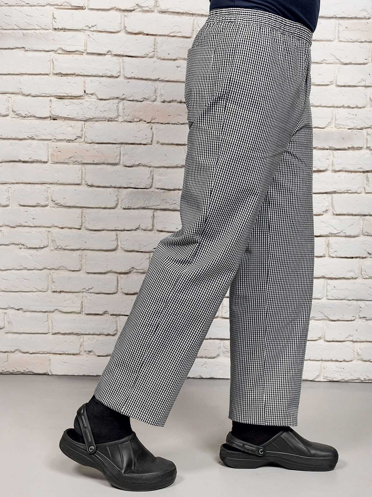 Pantaloni da chef in tessuto easy care, vita elasticizzata, taglie unisex, tasca posteriore applicata, chiusura lampo. Lavabile a 60°C.