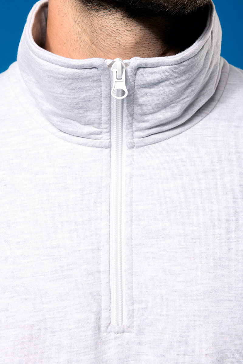 Felpa garzata. Maniche a giro. Collo con zip con nastrino di rinforzo. Fondo manica e fondo capo a costine tono su tono. Certificato STANDARD 100 by OEKO-TEX® N° CQ 1007⁄7, IFTH.