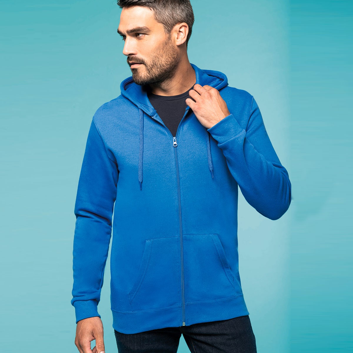 Felpa garzata. Maniche a giro. Zip in nylon. Cappuccio foderato con coulisse tono su tono. Tasche a canguro. Fondo manica e fondo capo a costine. Certificato STANDARD 100 by OEKO-TEX® N° CQ 1007⁄7, IFTH.