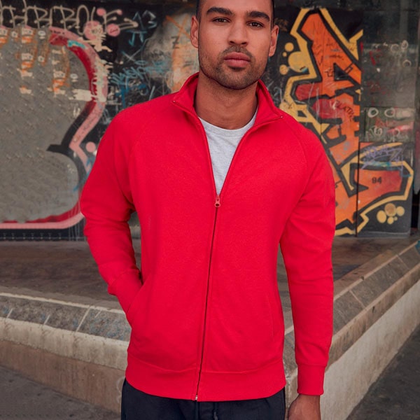 Felpa leggera sgarzata con maniche raglan, due tasche anteriori, fondo e polsini in costina cotone/Lycra®. Cerniera coperta per favorire la stampa, prodotta con filato Belcoro per una maggiore morbidezza, struttura con busto tubolare.