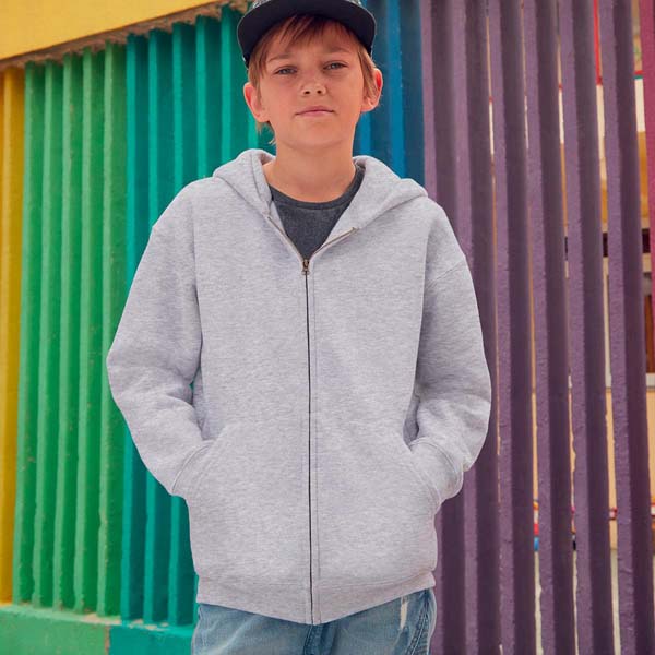 Felpa da bambino con tasca anteriore a marsupio, cerniera nascosta. cappuccio in tessuto doppio senza cordino, felpata internamente. Cuciture laterali.